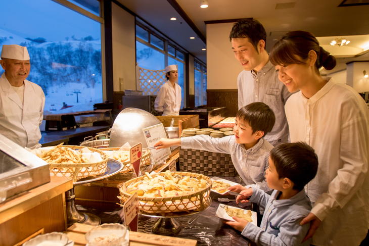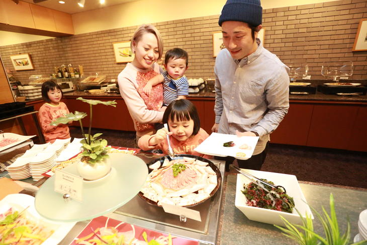 腹ぺこキッズお待ちかねの夕食は、高原野菜など地元食材を使用した、こだわりの和洋バイキング。ライブキッチンで揚げたてが楽しめる天ぷらやパティシエ特製のスイーツなど、バラエティー豊かな約60種類のメニューを堪能しよう。
