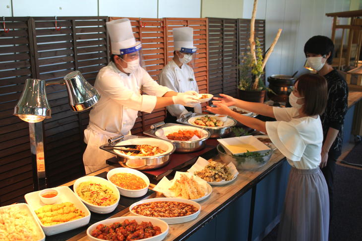 夕食は、安心・安全に配慮したバイキング「カフェテリア式食べ放題」を採用。利用者がトングで盛り付ける従来のスタイルではなく、冷たい料理は小皿で個々盛りにし、温かい料理はスタッフが盛り付けてくれる。