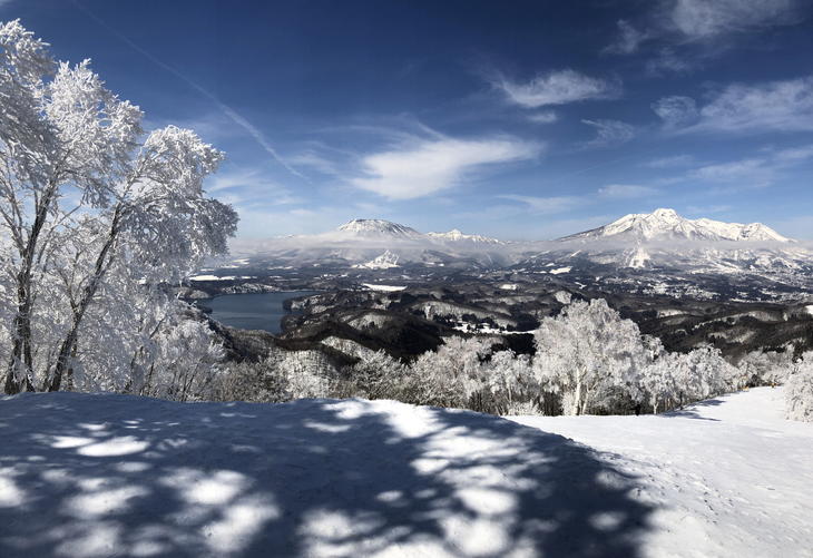 展望デッキからは野尻湖や北信五岳(妙高山、黒姫山、戸隠連峰、飯綱山)の美しい雪景色を眺めることができ、思わず大きく伸びをしたくなる気持ちよさだ。