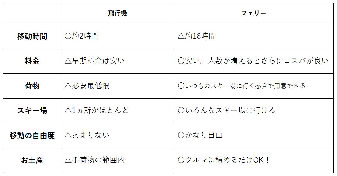 まず飛行機とフェリーの違いを簡単に比べてみると、移動時間以外はフェリーのほうが何かと便利なのがわかると思う。料金的にも飛行機の場合、早い時期に予約をしたり、LCC(格安航空会社)にすれば、かなり低価格の料金で行くこともできるが、スキーやスノーボードなど重たい荷物は自分で運ぶとなるとたいへんだし、超過料金(エクセス)を取られることもある。宅配便を往復で利用するにしても、北海道となると送料は意外と高額で荷物が届くのにも時間が掛かる。宿泊しながら移動と考えればフェリーのほうがお得と考えられる。