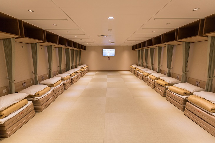 まずは船内で一番多くの時間を過ごす「部屋」から紹介しよう。部屋は予算や好みに応じて選ぶことができるが、基本料金では「ツーリスト」が設定されていて、いわゆる大部屋タイプとなる。客席の間をカーテンで仕切られ、それぞれに布団一式とコンセントが完備されている。荷物は上部の棚に置くことができる。