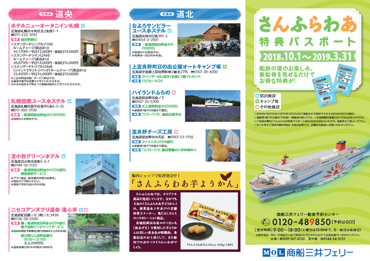 フェリーの利用者は「さんふらわあ特典パスポート」(2019年3月31日まで)として、提携先施設で乗船券を提示することで、宿泊施設や温泉施設、観光施設、飲食店などでさまざまな割引やサービスが受けられる。特典は乗船日から15日以内が有効期限となっている。ホテルなどの施設は事前に予約が必要なので、各施設に問い合わせてみよう。