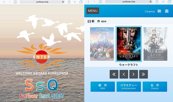Wi-fiを受信可能なPCやスマホ、タブレットがあれば、船内専用コンテンツ配信「SSQ(Sunflower Smart Quest/サンフラワー・スマート・クエスト)」で船内の詳しい情報を取得したり、約100タイトルの映画などを無料で楽しむこともできる。