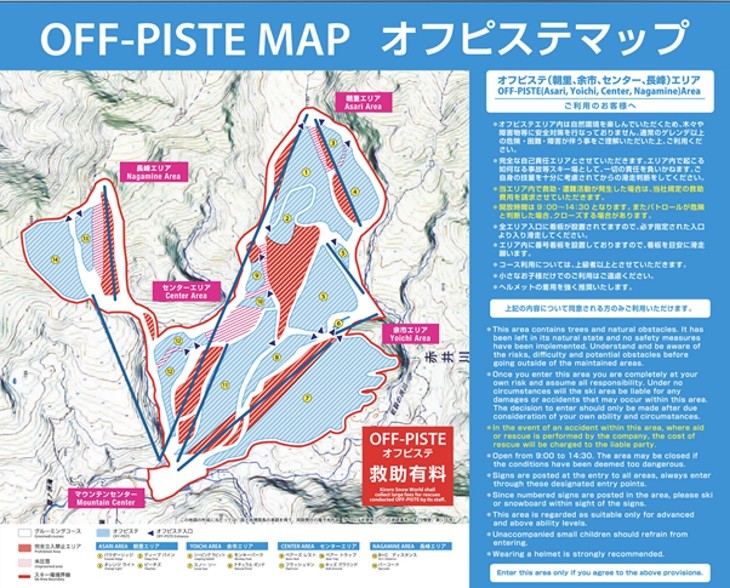 「オフピステゾーン」(下記オフピステマップ上の水色の網掛け部分)という名前で非圧雪、パウダーの斜面を広く開放している、北海道のキロロリゾートでは、オフピステゾーンでの事故についてはスキー場側が責任を取らず、救助作業が発生した場合には別料金を請求すると明記している。