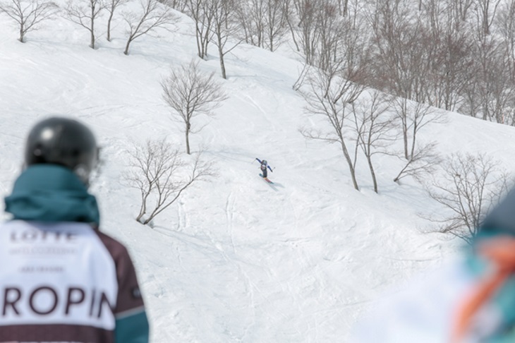 スタートとゴールだけが決まっており、下からジャッジが選手の滑りを見て、5つの項目を基準にスコアと順位をつける。事前練習は出来ず、斜面や地形を目で見て、どのラインを滑るかを決めるところが大きなポイントだ。
