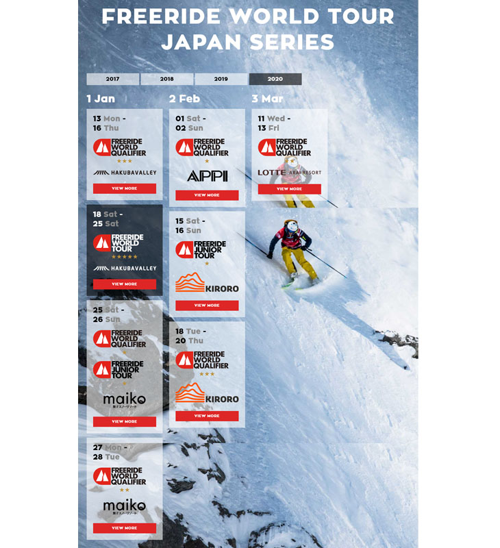 今回紹介した、スキー場内のフリーライドゾーンやバックカントリーでこの冬行われるのが、白馬村で昨シーズン行われた世界選手権、Freeride World Tourとその予選大会(FWQ)、ジュニア大会(FJT)。今シーズンは東北初開催の安比高原会場が増え、トップレベルからエントリーレベル・ジュニアまで全部で9つのイベントが行われる予定だ。