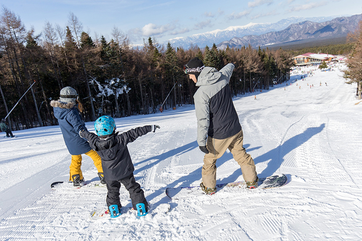 練習用スロープでは、お父さんやお母さんコーチの出番。しっかりと立ってバランスをとり、止まれるようになったらゲレンデデビューだ!