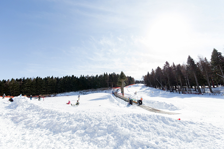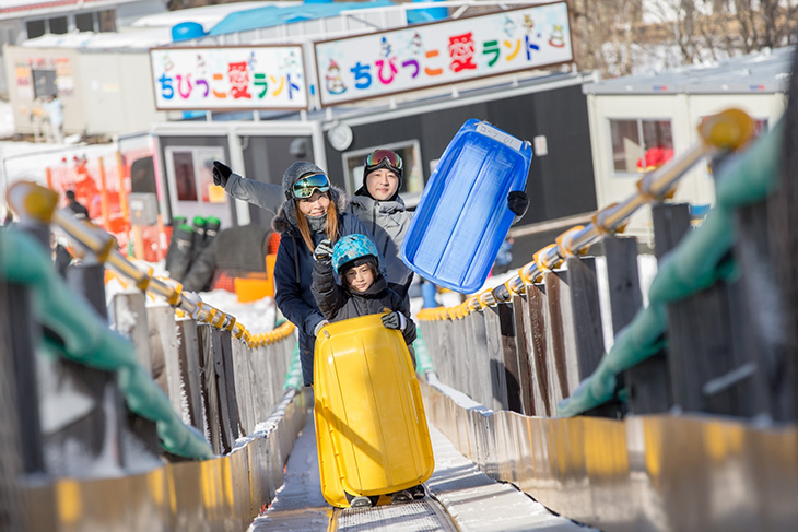 ファミリーコースからファミリーリフトを挟んで反対側には、雪遊びやそり遊びが楽しめる「ちびっこ愛ランド」がある。入場料はひとり700円だが、リフト券を購入していれば無料だ。そりゲレンデには動く歩道を完備。小さな子供でもそりを持ってラクに登ることができる。そりはレンタルも用意している(有料:1台500円)