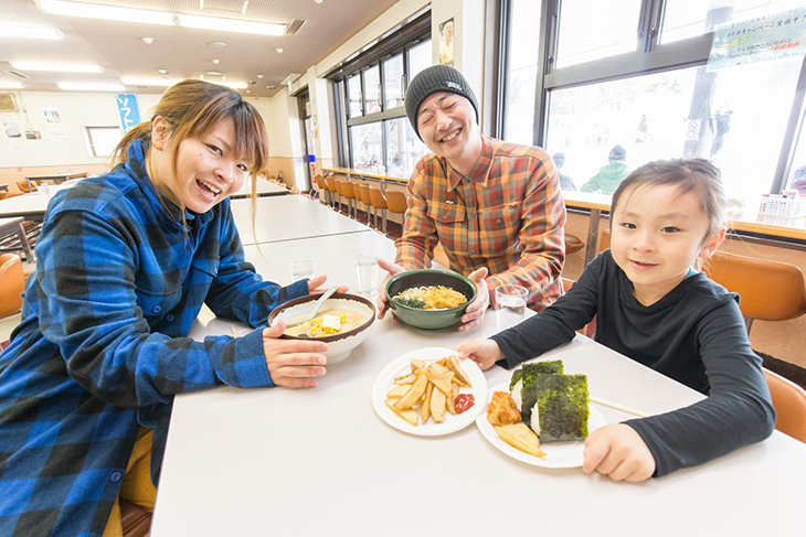 センターハウス1階にある「ケルン」は麺類のメニューが充実。1月2月は晴れていても寒い日が多いので、身体を温めたい時にはおすすめだ。地元産の食材を使用し、おにぎりも絶品。