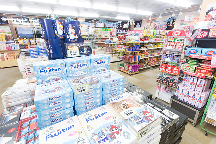 売店には、ふじてんオリジナルのお土産からスキー用品まで、充実の品揃え。アフターも子供と一緒にお土産選びを楽しみたい。
