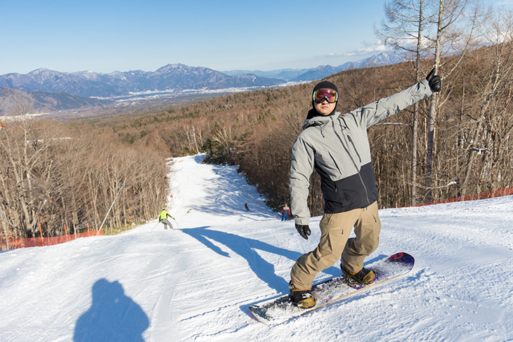 ファミリーコースのトップからは南アルプスの眺望や眼下には樹海が広がっている。センターハウスを意識して滑ると目線が下がらず、ポジションも自然と良くなる。