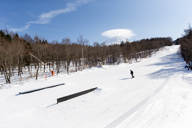 スキー場に到着すると、ゲレンデを見下ろすように、日本一の高さと美しさを誇り、日本のシンボルでもある富士山が間近に迫るロケーションだ。