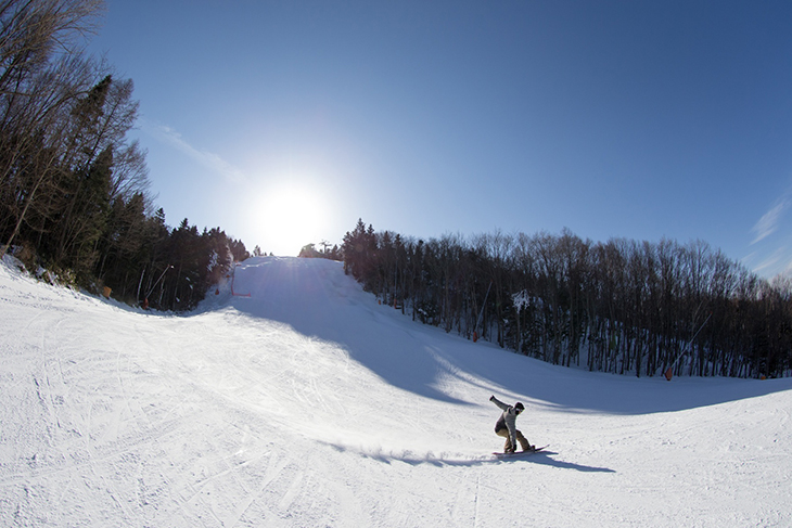 今度はクワッドリフトからパノラマリフトを乗り継いで、ゲレンデトップのダウンヒルコースへ。ふじてんで最も急なコースだが、下部は広いので安心。
