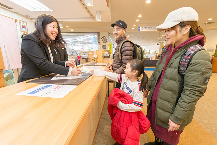 まずはフロントでチェックイン。気さくで親切なスタッフがご案内してくれる。フロント奥には広いロビーに売店があり品揃えも充実。