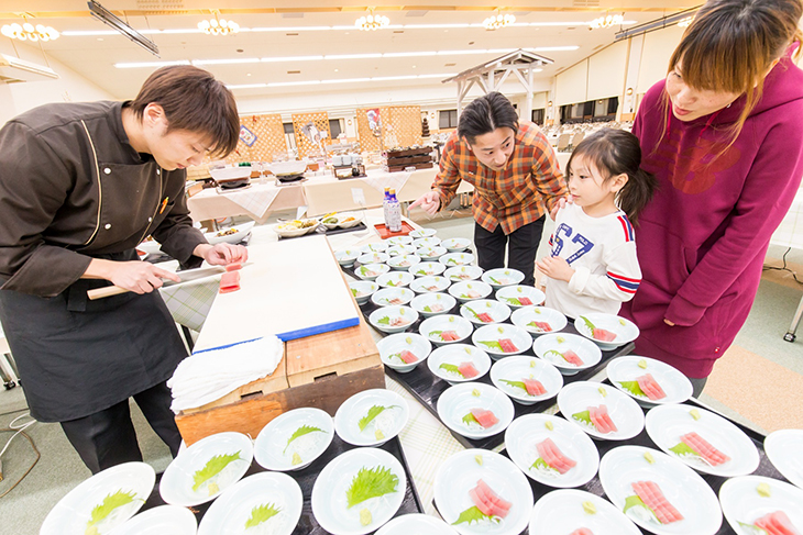 夕食はビュッフェスタイルで旬の食材をふんだんに取り入れた料理を好きなだけ食べることができる。用意されるお刺身も新鮮で人気だ。