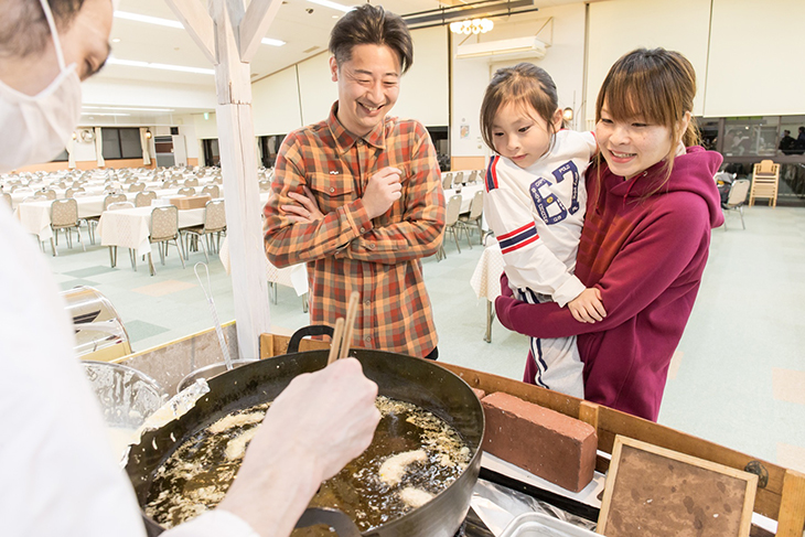 天ぷらも揚げたてが食べられる。揚げているところを見ていたお父さんのアタマの中では、ビールと一緒に熱々の天ぷらを食べるイメージが浮かんだのか、満面の笑み。