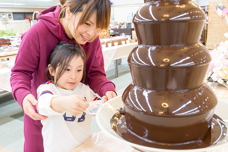 たくさん食べた後でも甘いモノは別腹。子供はチョコレートファウンテンにも大感動。