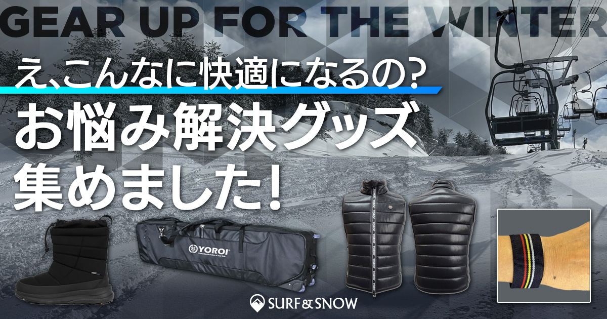 SURF&SNOWユーザーにとって、冬の最大の楽しみのひとつであろうスキー&スノーボード。白銀の世界で過ごす時間は非日常を味わえる最高の時間である一方で、やはり日常とは違う分、苦労することや苦い経験というのもつきものだ。たとえば、「雪国に着いた瞬間、いつもの靴では一歩も外を歩くことができなかった!」、「凍っている路面で転倒し、滑り以外で怪我をしてしまった」、「夢中になって滑った翌日、転倒したダメージで体が痛すぎて動けなかった」、「荷物が多すぎて移動することに疲れてしまった」などなど。
