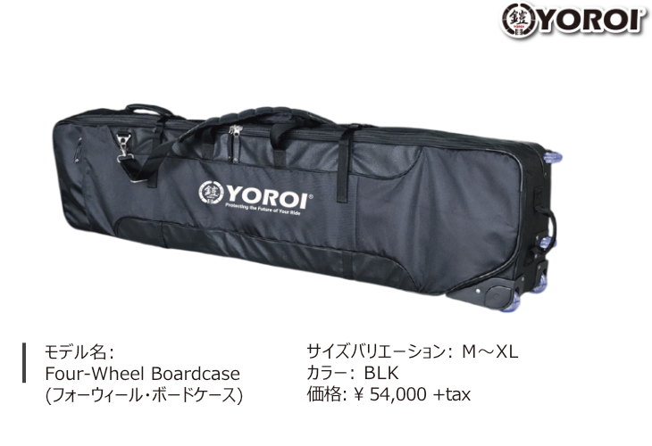 YOROI フォーウィールボードケースは、4つのウィールで縦・横どちらにもスムーズに転がせる快適設計。狭い通路や駅構内、階段、狭いパーキングでもストレスゼロで移動できる。ウェア・ブーツ・小物もまとめてしっかり収納できる大容量で、スキー固定ストラップも装備。折りたためばコンパクトになり、遠征・車移動・保管にも最適な万能ケース。4輪だから重さを感じず軽やかにスイスイ移動。冬の遠征にバッチリのオールインワン仕様。