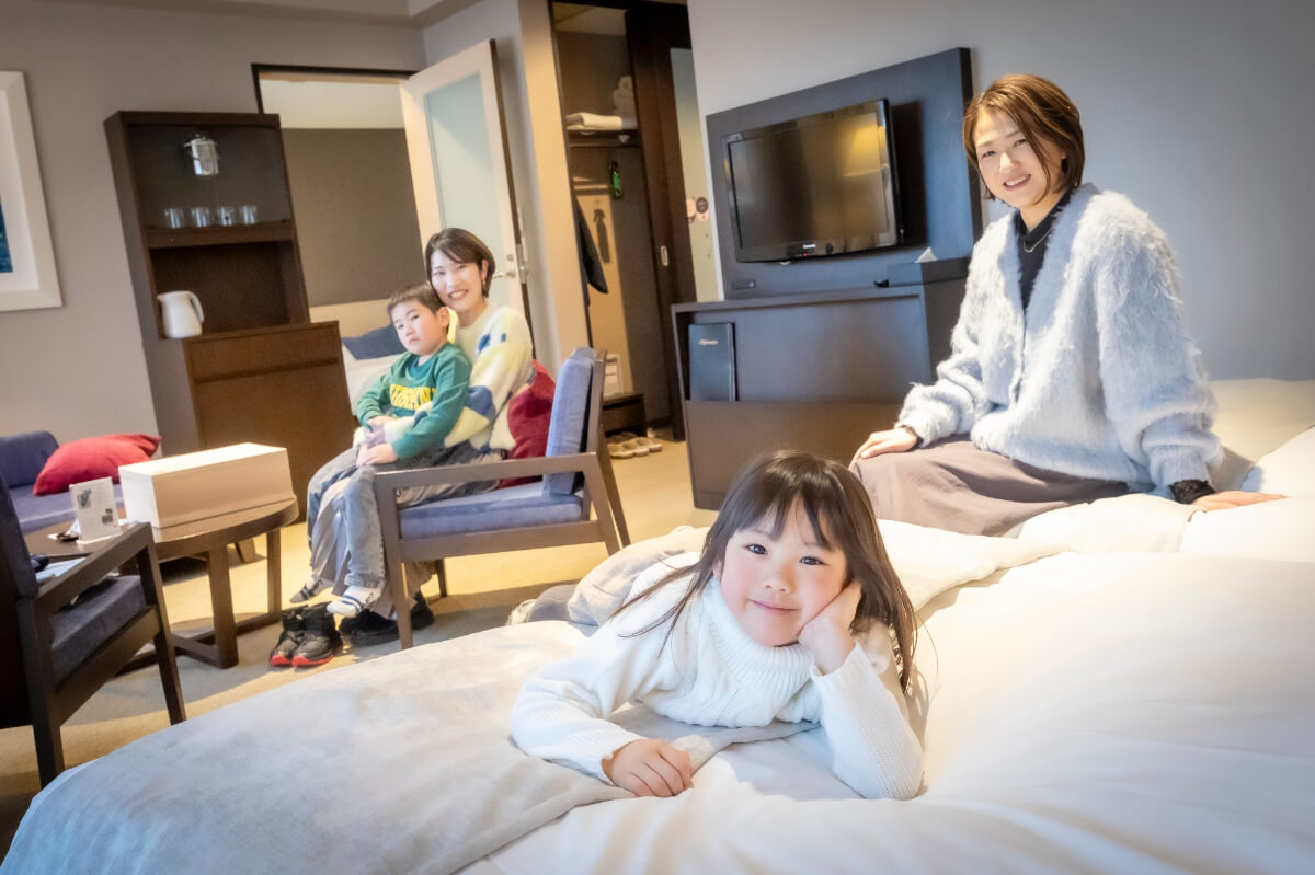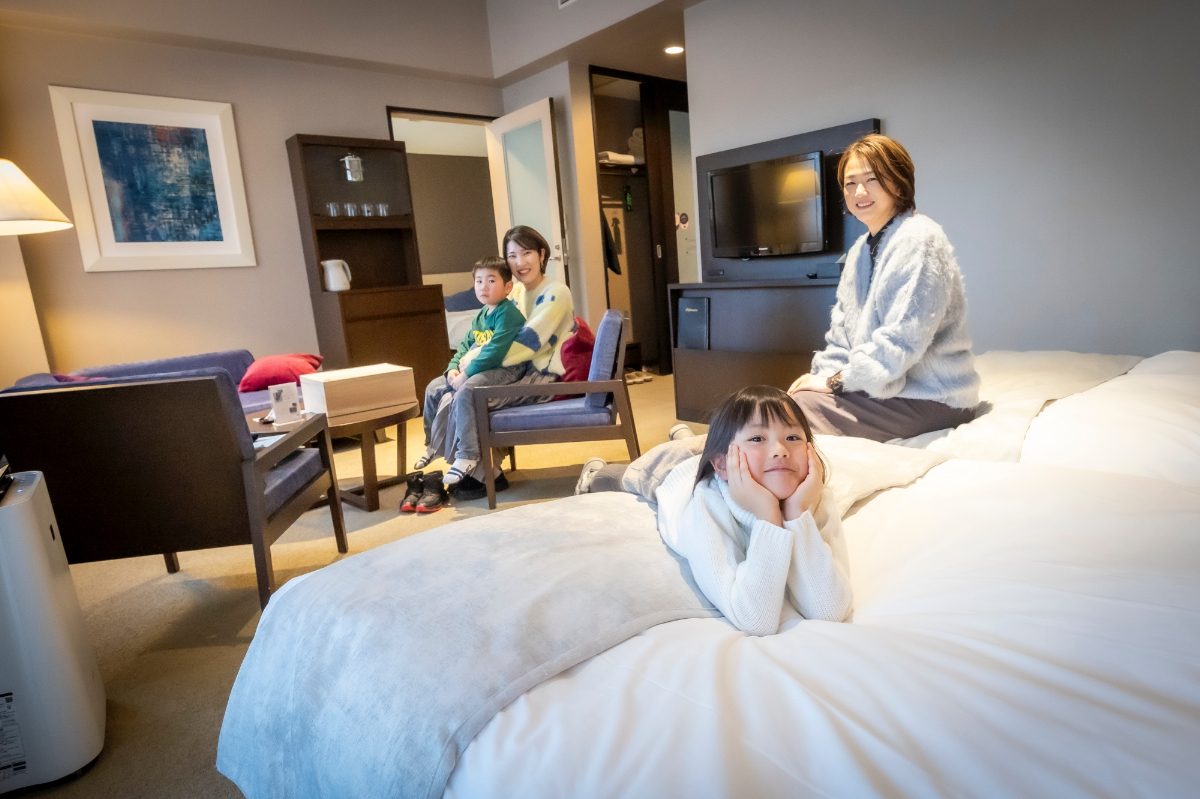 夕方、暗くなってきたら部屋に戻って着替えを済ませ、夕食までの時間はリラックス。ホテルの部屋は利用する人数や目的などによって、さまざまなタイプがある。今回泊まった部屋は親子2家族での利用ということもあり、2つのベッドルームがある「スタンダードファミリー」を選択。