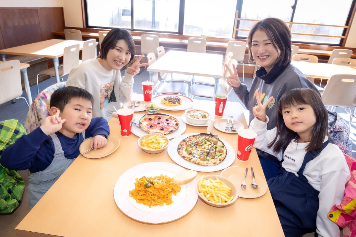 気持ちよくたくさん滑ったら子供たちのお腹もペッコペコ。ランチはゴンドラ山頂駅の「BUNA BUNA(ブナブナ)」へ。窓からの眺めも抜群なので、休憩時にもぜひ利用してほしい。
