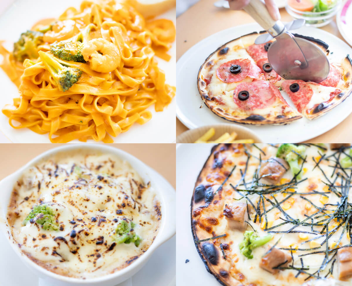 本格的な釜で焼かれたピザは子供たちも大好き。ファミリーならパスタやグラタン、ポテトなどを頼んで、みんなでシェアして食べるのがおすすめ!