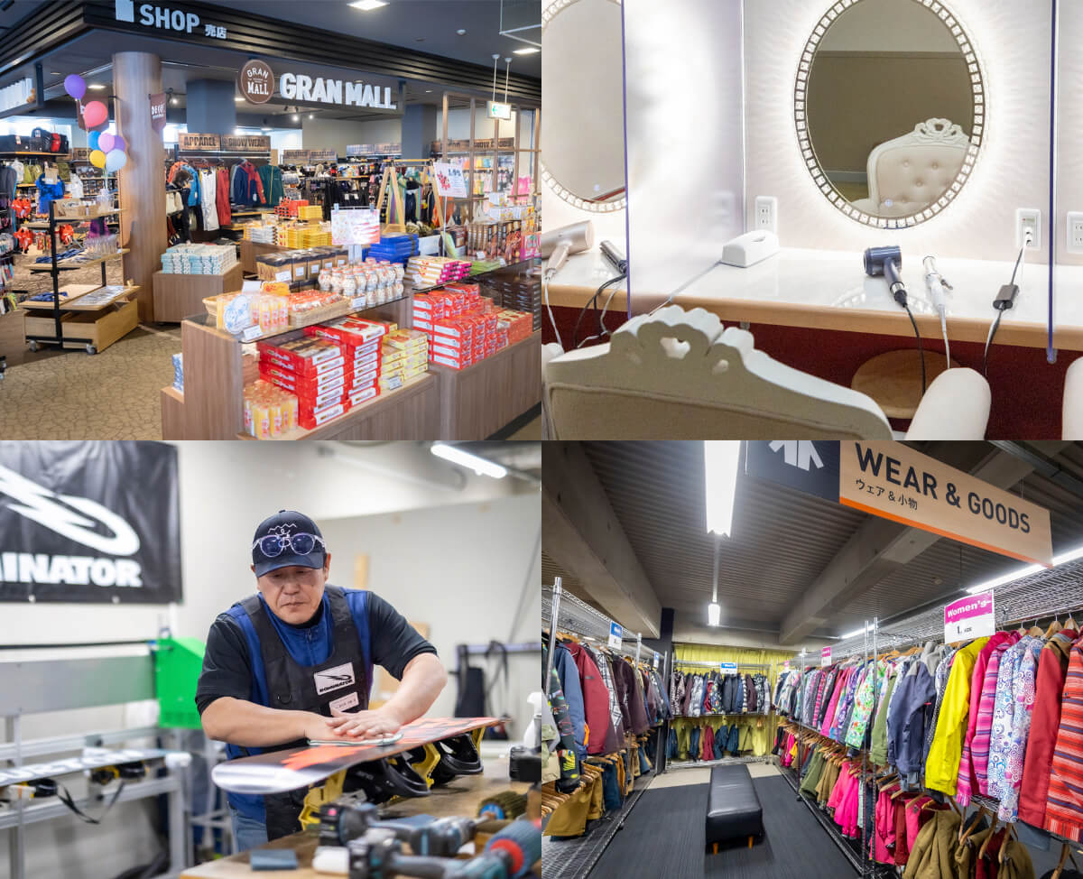 マウンテンセンターは他にも便利なポイントがたくさんある。お土産選びも楽しい品揃え充実の売店。イーストウィングの女性用トイレにはドライヤーやヘアーアイロンを完備。日帰り用のレンタルは、自分の好きなウエアや道具を自由に選べる方式で大好評。自分の板が滑りにくいなと感じたら、本格的な職人によるワックスサービス(有料)も利用しよう。