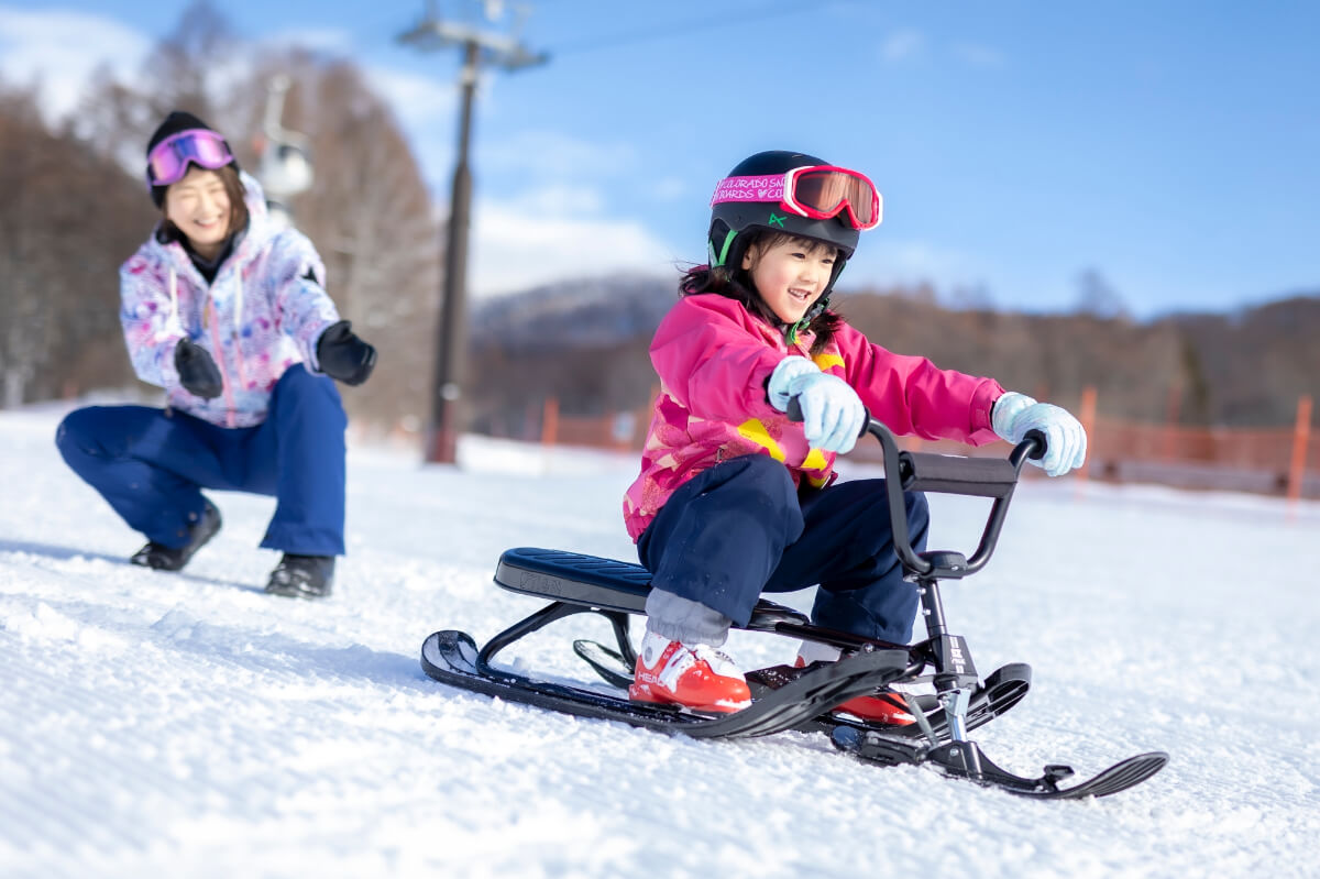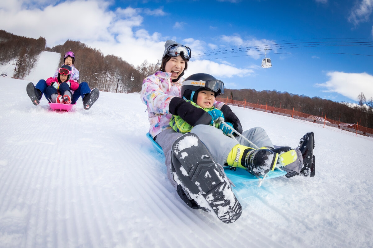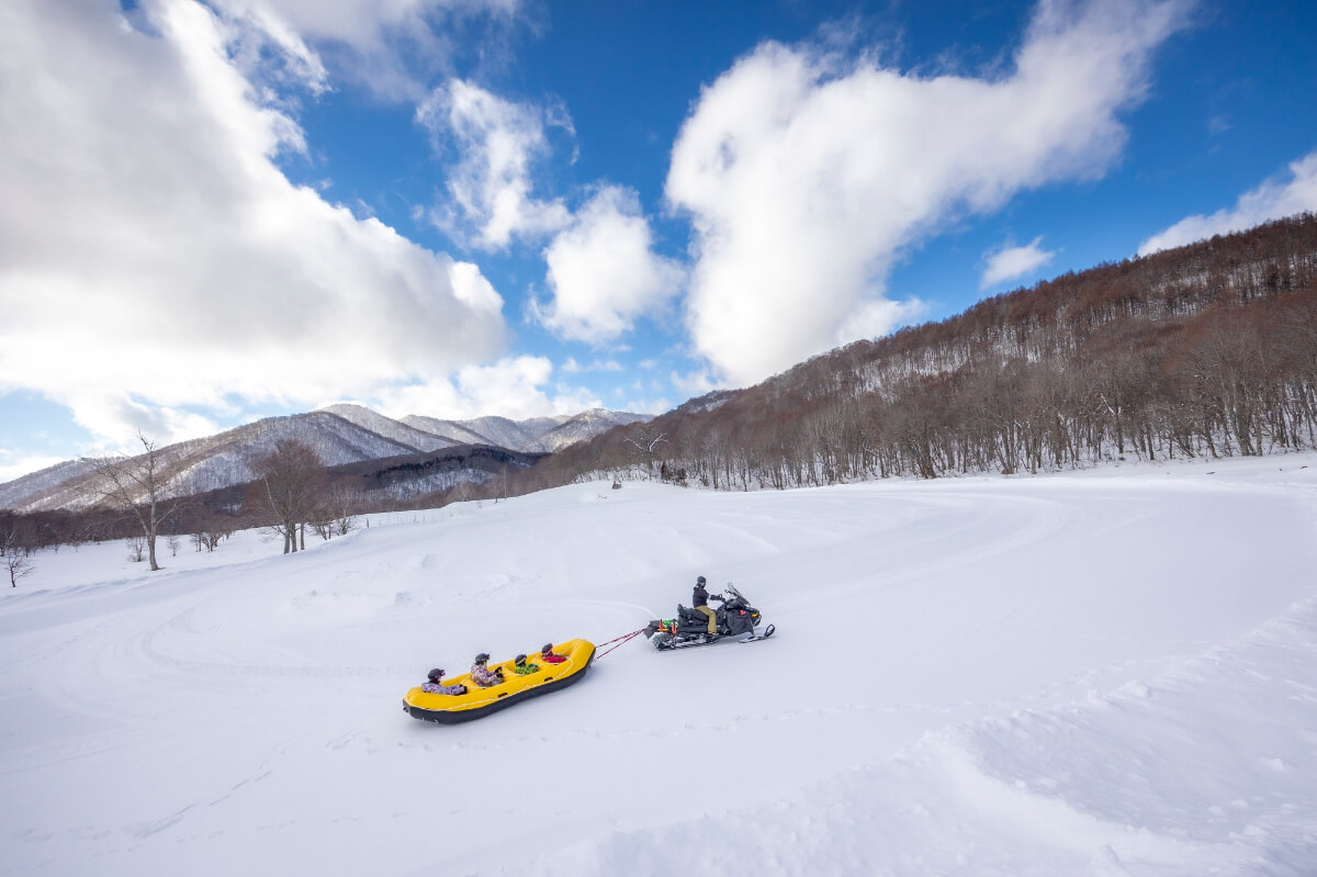 スキーやスノーボードをしない人も楽しめるアクティビティ。最新のスノーモービルに引っ張られ、思った以上のスピード感に驚いたり、ボートが気持ちよくドリフトしていく感覚などを楽しむことができて、子どもだけでなく大人も大喜び!