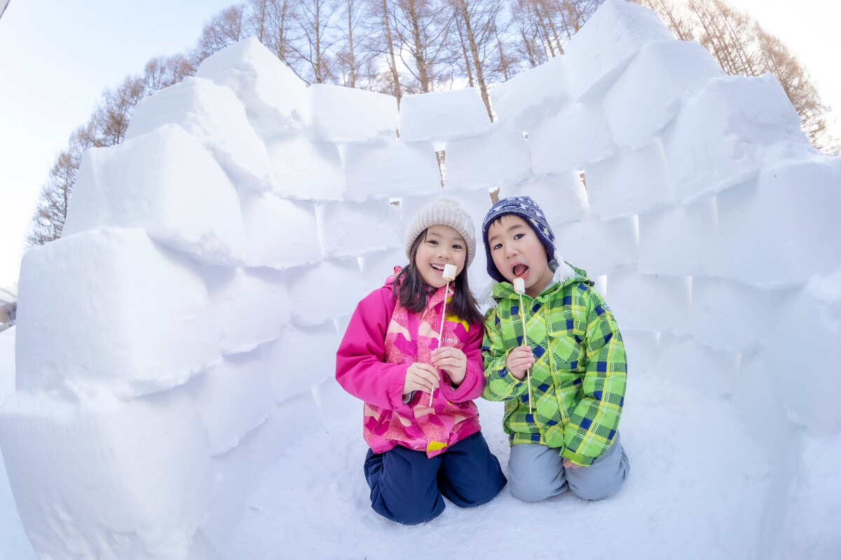雪のブロックで作った「かまくら」で食べることもできる。風が来ないだけでも、かなり体感温度が変わってくる。