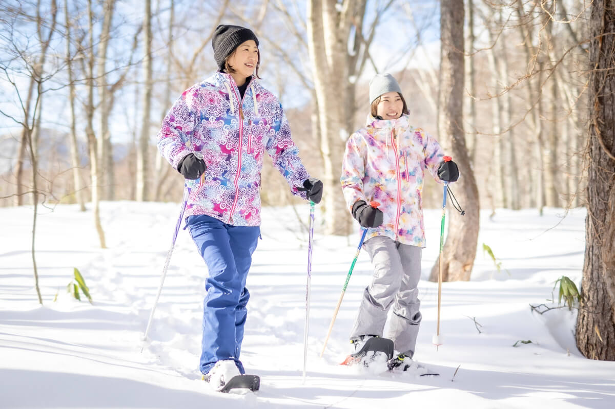 ホテル近くの森の中などを少し散策できるスノーシュー体験も好評。スキーやスノーボードができない人も楽しむことができるアクティビティの一つなので、ぜひ雪の上で遊ぶ楽しさを体験してみてほしい!