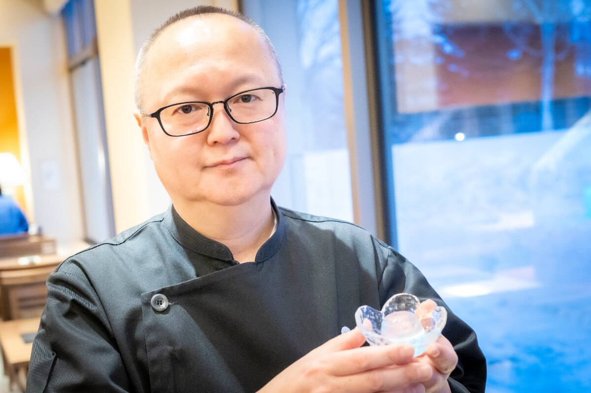 グランデコの周辺を流れる「小野川湧水」を使って、食材本来の美味しさを引き出しながら、数々の素晴らしいメニューを提供している料理長の伊藤克己さん。中でも小野川湧水を“食べる”をコンセプトに「水」そのものをひとつの料理として開発した「みずたま」は、まさにグランデコでしか味わえない逸品だ。