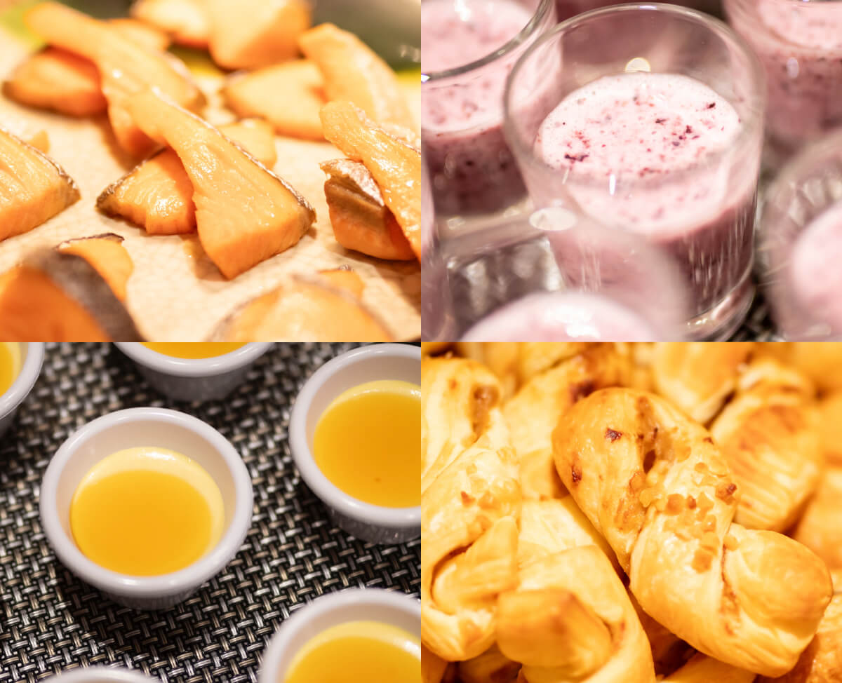 夕食同様、朝もメニューが豊富。おかずもいっぱいでご飯にしようか、焼きたてのパンにしようか悩むのはもちろん、スムージーも飲んでみたい、デザートのプリンも食べたいと、食べたいものだらけ(笑)