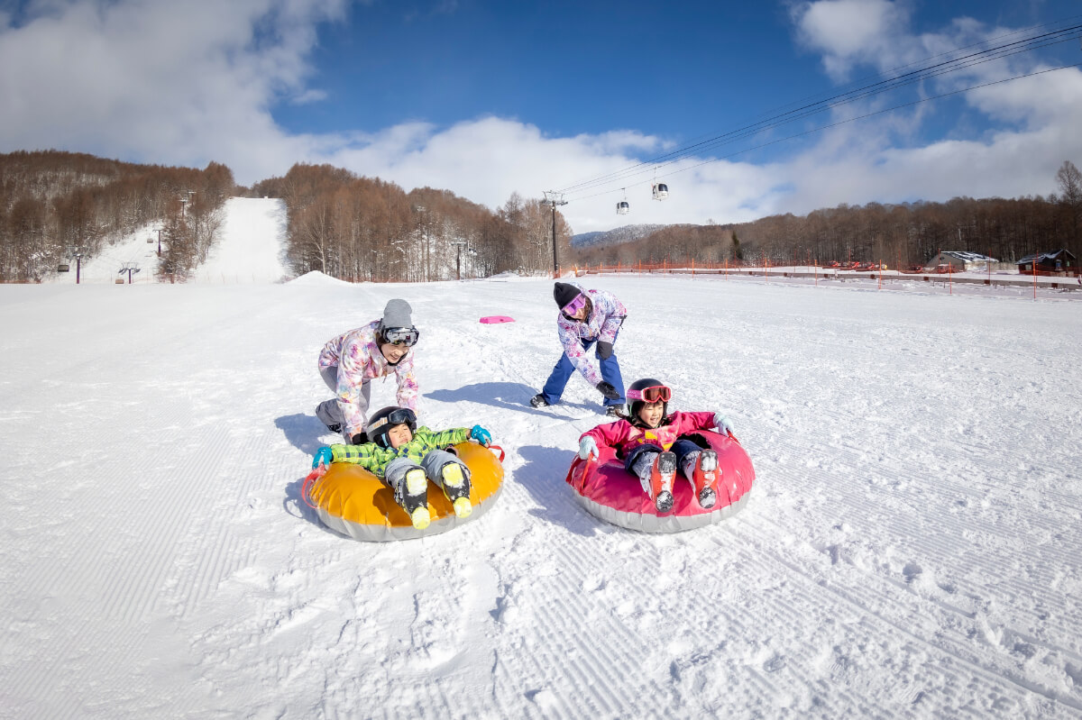 キッズパークの料金は1日1200円(2歳以下、無料)。12時から使える午後券は800円。リフト券購入者は500円だ。キッズパークにはいろいろなタイプのソリやチュービングなどの遊具が用意してあり、自由に使って遊ぶことができる。