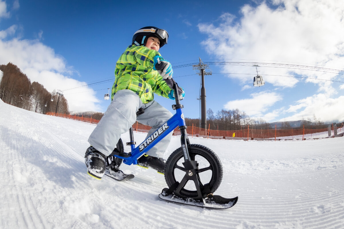 男の子たちに人気のストライダー。たとえ途中で転けてしまっても雪の上だから大丈夫!