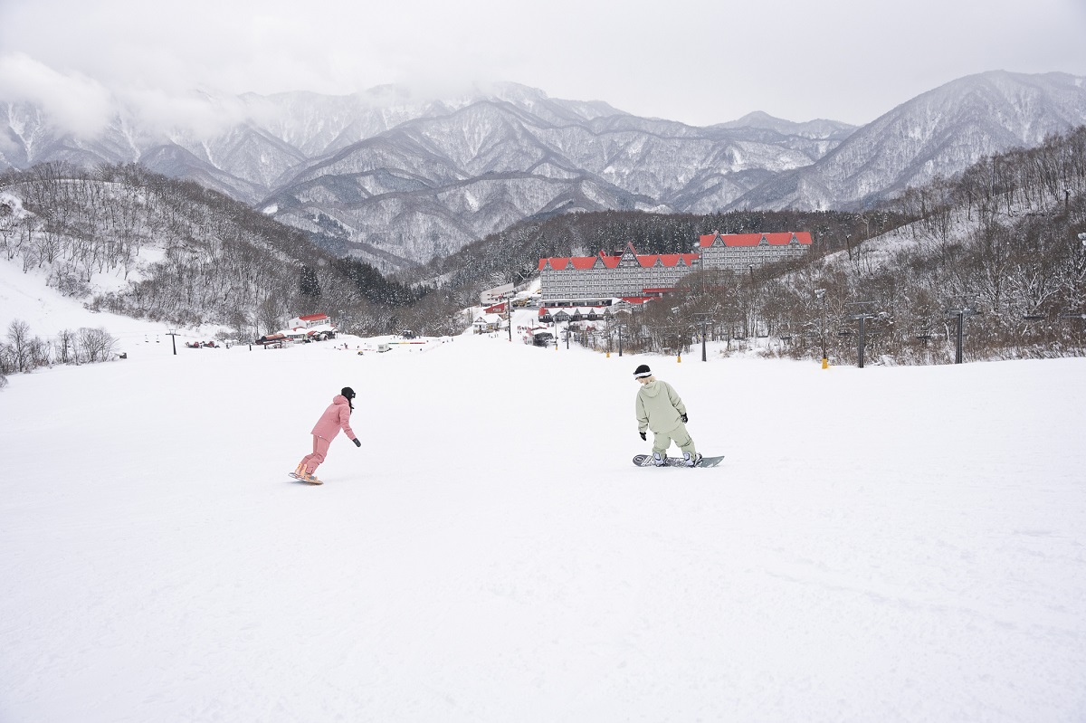 スキー場内のコースのいたるところから、赤い屋根のホテルが見えるのもこのスキー場の特徴。ゲレンデ全体がすり鉢のような形状となっているので、どこを滑っていてもホテルがあるベースエリアにたどり着くことができる。迷子になる心配がないので、レベルの違う仲間同士でもそれぞれのペースで安心して滑ることができるのがうれしい。