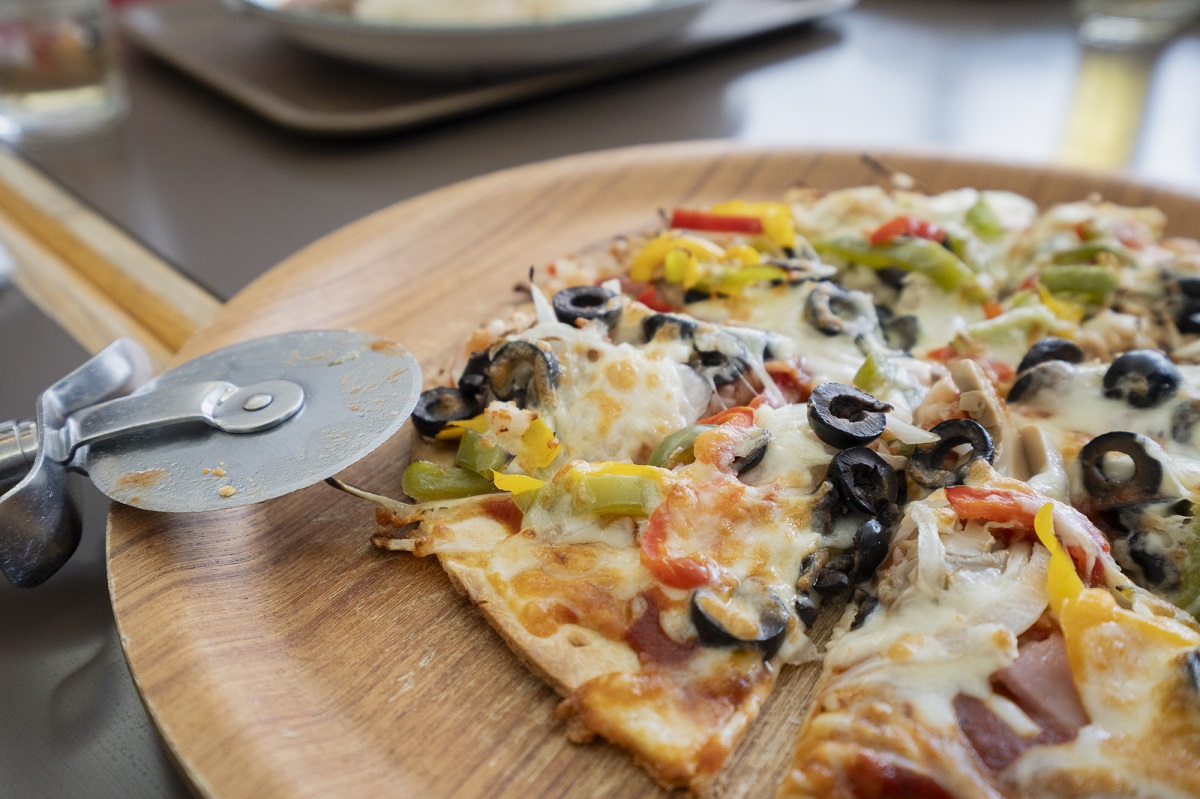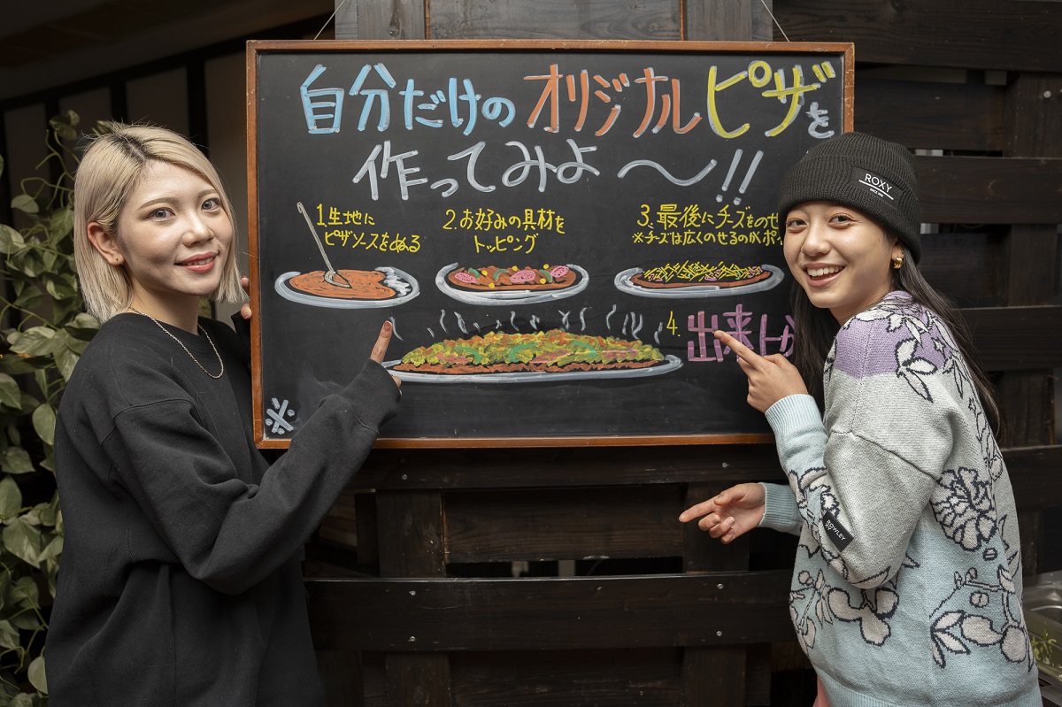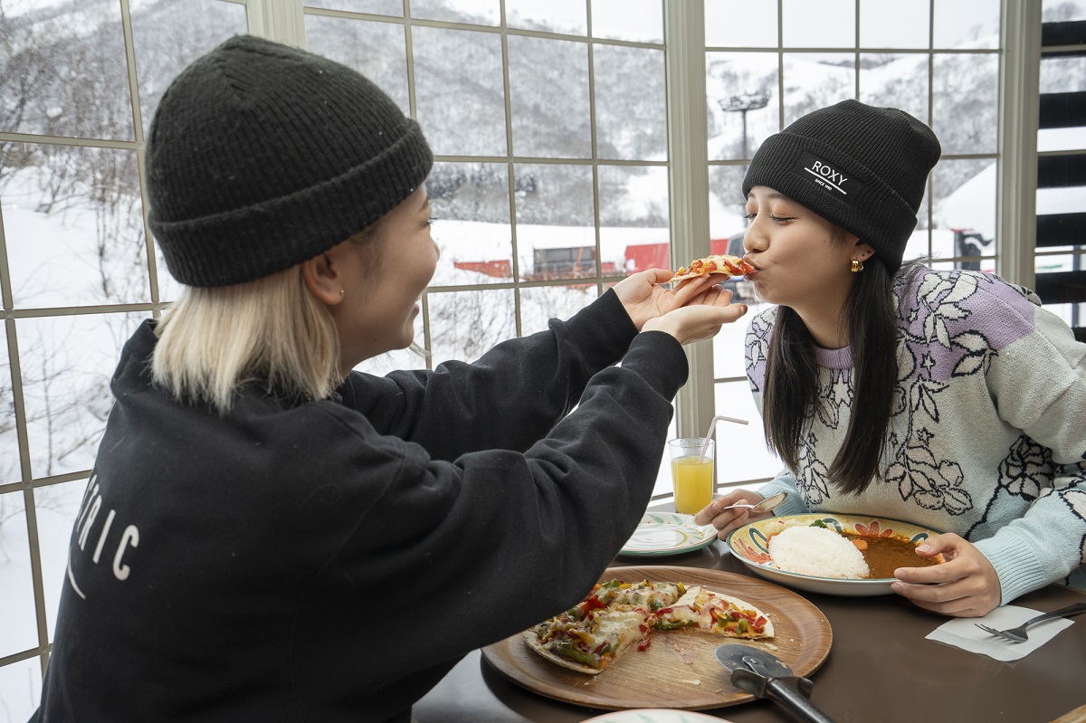 滑りの合間の休憩タイムもお楽しみがたくさん! まずランチにオススメなのは、ホテル1階にあるティーラウンジ「りりかる」。ここでのオススメは、何と言っても自分で具材を好きなだけいれることのできるオリジナルピザ。お好みのソースを塗って自由にトッピングした上にチーズを乗せ、専用のオーブンに乗せたら、パリパリ生地が香ばしいオリジナルピザの出来上がり!作るのも食べるのも楽しい人気メニューだ。