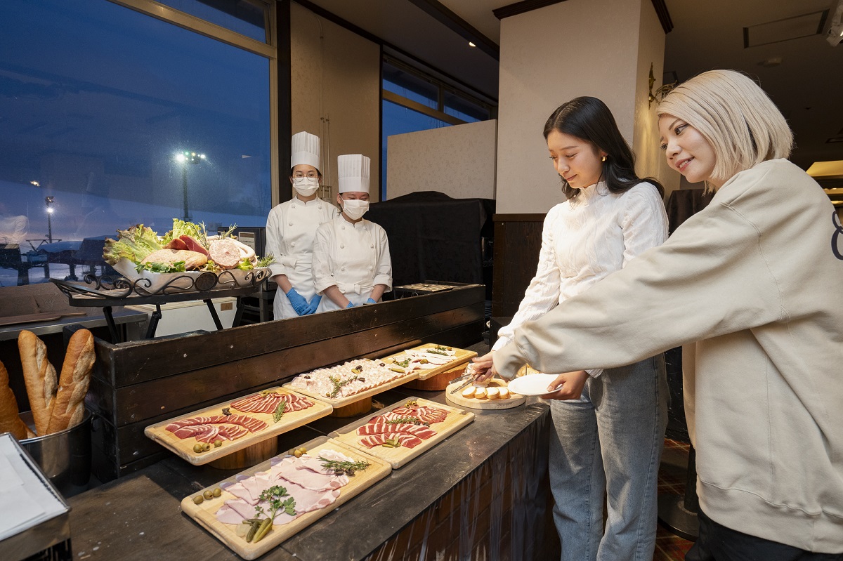 思い切り滑りを満喫したら、そのままホテルにチェックイン。ホテル内には、天然温泉、サウナ施設などがあり、客室は機能的な和洋室がメイン。地元信州の食材を生かしたメニューとシェフこだわりの料理が並ぶ、信州プレミアムビュッフェもお楽しみ!