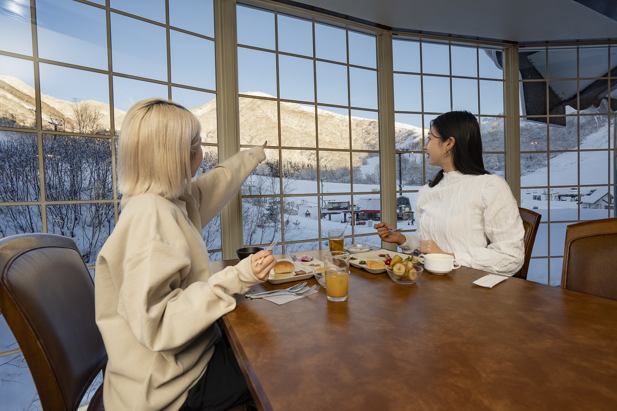 翌朝もスキー場を眺めながらゆったり朝食バイキングを。誰もいないゲレンデを目の前に、「今日はどこを滑ろうか?」朝から話が弾む。