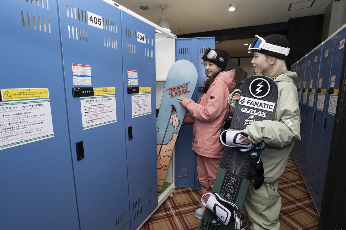 滑る道具はロビーの宿泊者専用ロッカーにすべて収納しておいたので、着替えを済ませたら身軽にそのまま下に降りるだけで楽チン。大型のロッカーは4桁の数字でロックの設定ができるので、キーを持ち運ぶ必要もなし。ホテルを一歩出るとすぐそこがスキー場なので、とにかくすぐに滑り出せることに、この上ない優越感を感じることができるだろう。