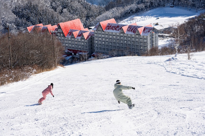 全16コースを擁する充実のゲレンデは、つぼ型のレイアウトが特徴。ほぼすべてのコースがホテル方面へ向かう構造になっているため、初めてでも迷いにくく、安心して滑走できます。一方で、最大斜度42度の上級者コースも複数用意されており、初心者からエキスパートまで幅広いレベルの方が楽しめるスキー場です。海外からのウィンタースポーツ愛好家には、ツリーエリア(自己責任エリア)での滑走が人気を集めています。