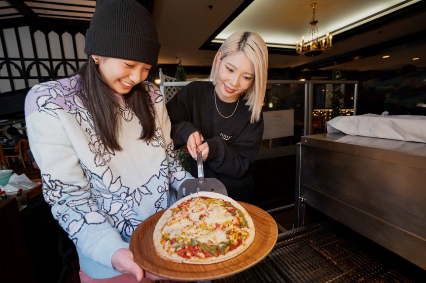 好きなトッピングを選んで自分だけのピザを作るという、あこがれの体験ができます。薄型のクリスピー生地は香ばしい焼き上がりで、たくさん滑って消費したエネルギーを美味しくチャージできます。
