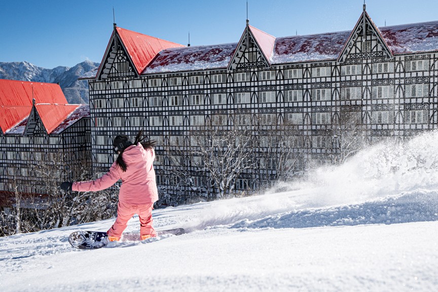 さらに、赤い三角屋根が特徴的なホテルグリーンプラザ白馬がゲレンデに直結していて、海外リゾートのような雰囲気と利便性の高さも大きな魅力です。ゲレンデからホテルまでは徒歩10秒なので、スキーやスノーボードを楽しんだあと、すぐにお部屋でくつろげます。ホテルの目の前にはキッズパークもあり、雪遊びやチュービング、ソリなど、家族みんなで安全に楽しめるところもポイントです。
