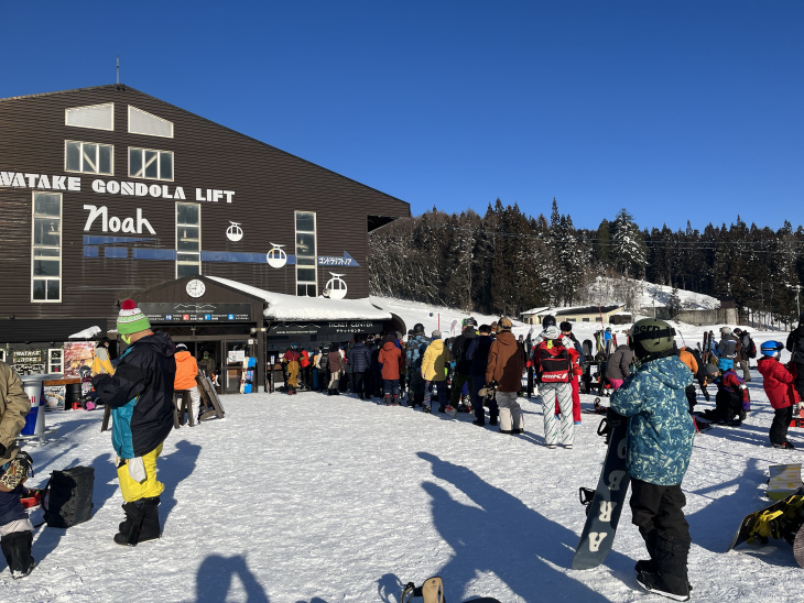 さすが人気ゲレンデだけあって、この日もチケット発券所とゴンドラ乗り場は多くの人でごった返し!到着してから1時間以内にでゴンドラに乗車して山頂に辿り着けたならラッキーなほうだ。しかしそんな人混みを通ることもなく、S-CLASSならゴンドラに優先乗車ができてしまう。一般のゴンドラ乗り場とは別の入り口から階段を上り、本当に待ち時間0分でゴンドラに乗り込めるなんて、気分は本物のVIPだ。