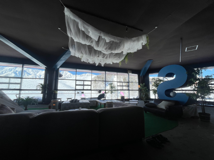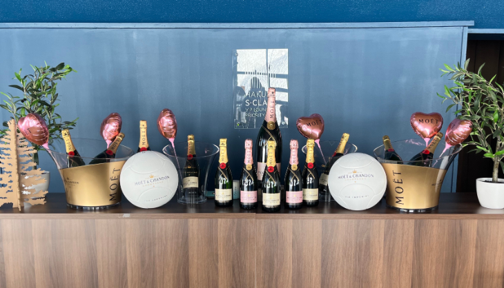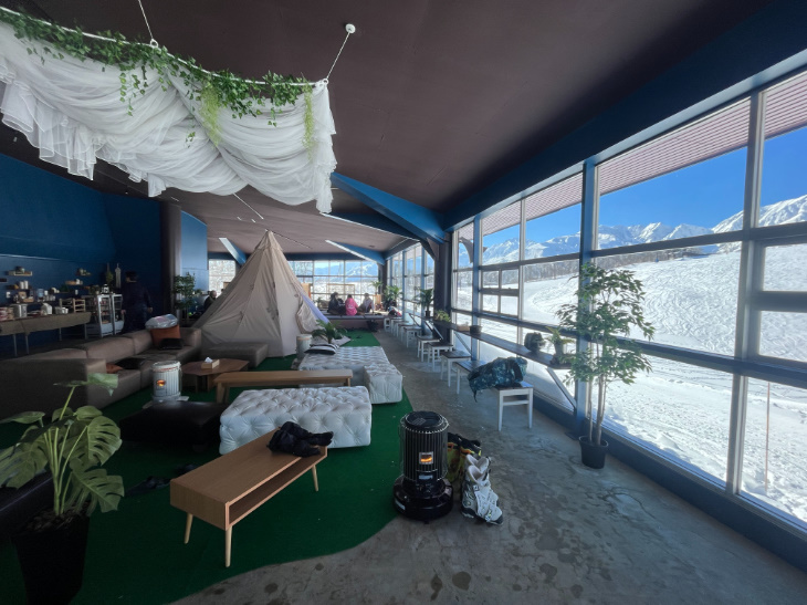 ゆっくりとチルタイムを過ごすなら、S-CLASS自慢のメインラウンジへ。メインラウンジの建物はゲレンデの中腹にポツンとある。一般のコースからは逸れた場所にあるため少しアクセスしづらいのだが、それと引き換えに超絶ビューを独り占めできるVIPなご褒美が! 50人収容可能な広々としたスペースはキャンプをイメージしたオシャレで洗練された楽しい空間となっていて、まるでゲレンデに来ていることを忘れてしまいそうになるくらい。大きな窓からの景色はどこを覗いても北アルプスが見渡せる特等席で、ついついカウンターに並ぶMoët et Chandonがすすんでしまうかもしれない。特別な景色の中で嗜むシャンパーニュはまた格別だ。メインラウンジを利用できるのは10:30~15:00なので、あらかじめここで寛ぐ時間を念頭に入れてゲレンデを楽しむのがオススメ。