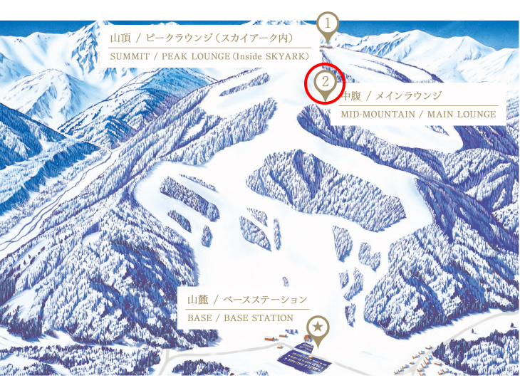 ゴンドラ&リフト待ちがない分たくさん滑れるので、ほどほどにパワーチャージもしたくなる。そんな時は、山頂レストラン「スカイアーク」内2Fにある「ピークラウンジ」へ。ここは、ブーツを脱いでゆったりくつろげる小上がりのラウンジでドリンクや軽食が完備されており、財布を持ち歩くこともレジに並ぶ必要もない。S-CLASS利用者であれば9:00~15:30の間いつでも自由に利用できるので、リフレッシュにぴったり。今の時代、滑りの合間の休憩も混雑と無縁なのは、誰にとってもうれしいサービスだろう。