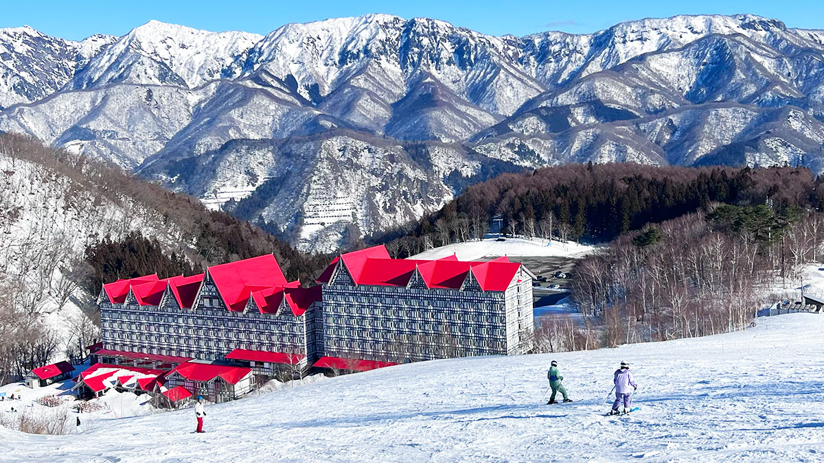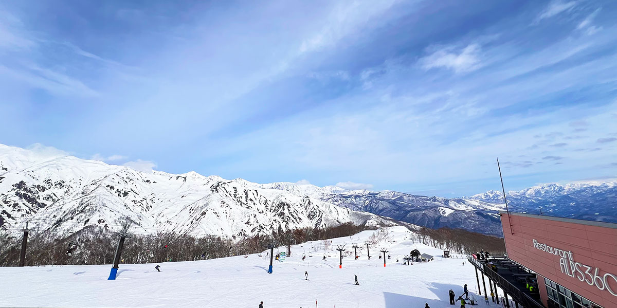 3,000m級の北アルプスを背景に、広大なスケールと豊富な降雪量が魅力。横幅1,200mに及ぶ大緩斜面はファミリーやビギナーに最適。山頂まで行ける長さ4,000mのゴンドラリフトで約5kmのロングクルージングを楽しめます。