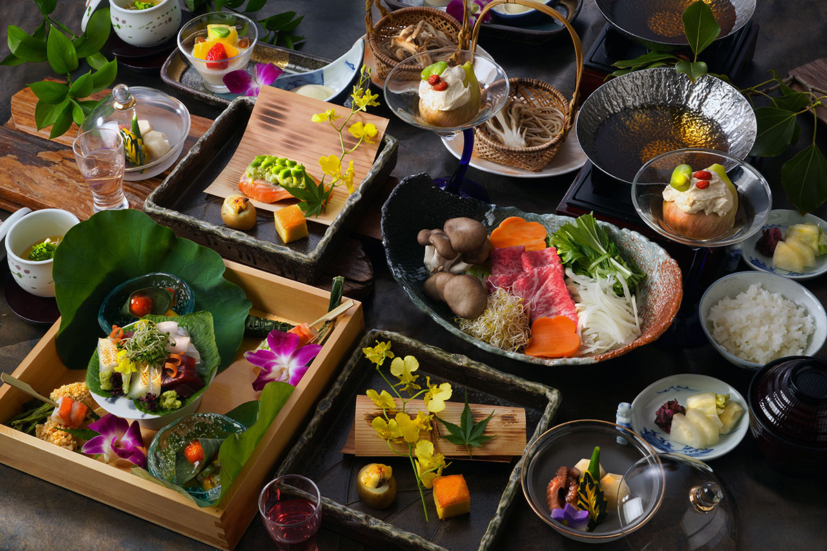 「緑翠亭 景水」の魅力は信州の地の幸を使った会席料理。見た目も華やかで味もボリュームも非の付け所なし。次から次へと運ばれてくる料理にお腹も心も満たされること間違いなし。