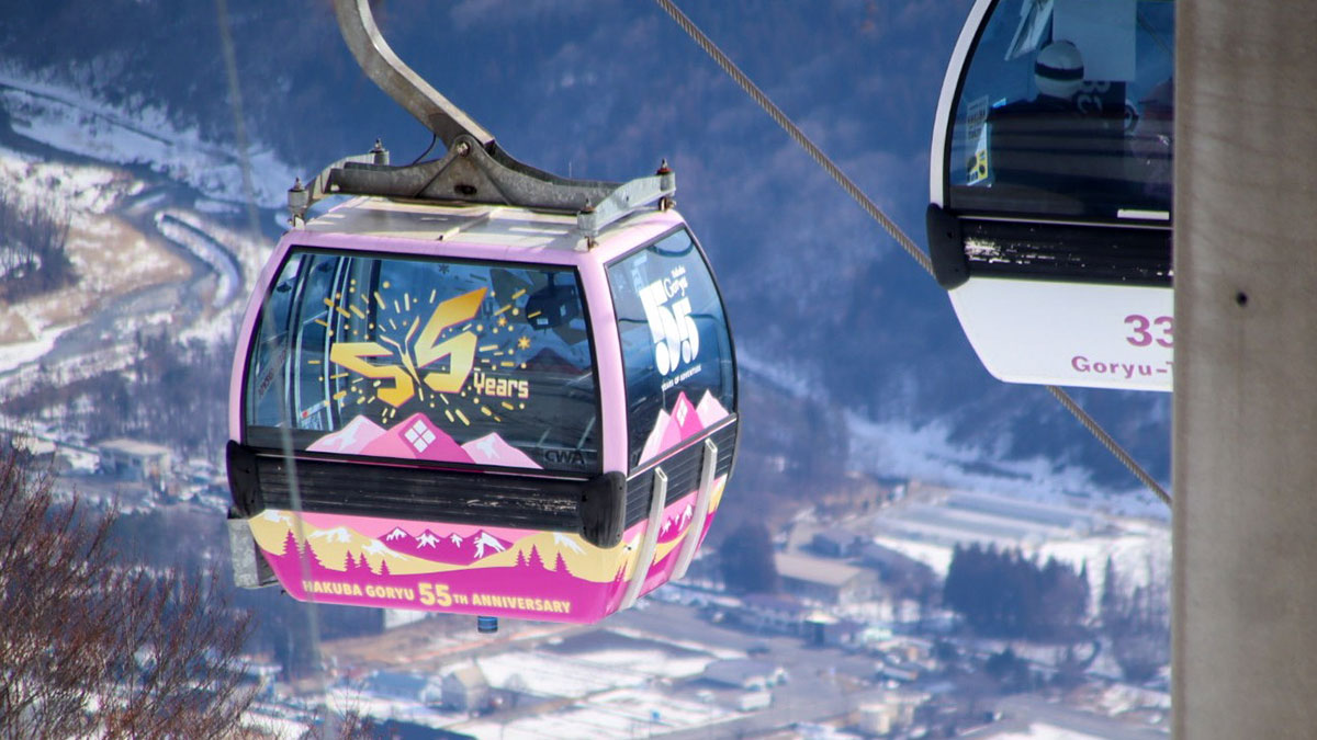2日目はエイブル白馬五竜からスタート。エイブル白馬五竜も今年で開業55周年。五竜ゴンドラ「テレキャビン」には特別なラッピングゴンドラが1台登場。ゴンドラ内には特別なサービスが!ゴンドラ山頂駅のアルプス平までの約8分間、ゴンドラ内で楽しめるサービスとなっているので、ぜひ現地で体験してほしい。