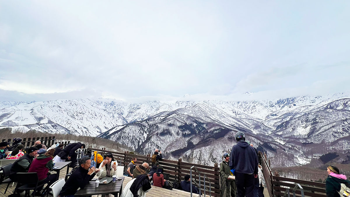 白馬岩岳スノーフィールドのおすすめは、北アルプスを一望できるHAKUBA MOUNTAIN HARBORのテラスからの絶景。併設されているTHE CITY BEKERYのドリンクやマフィン、クロワッサンなどを絶景テラスで堪能することができる。