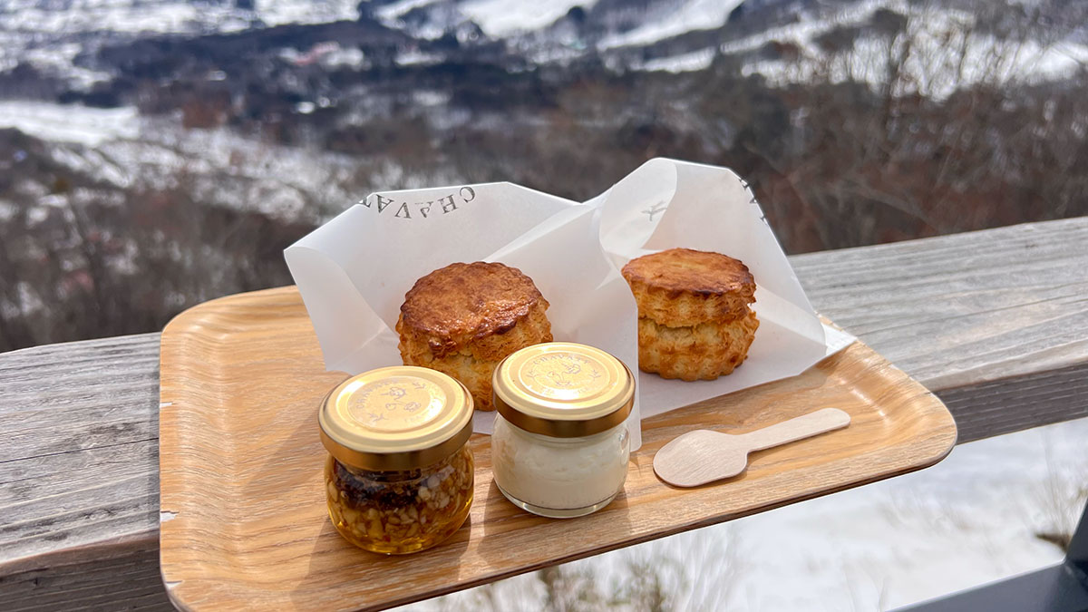 このノンスキーヤーも楽しめるIWATAKE WHITE PARKエリアから、リフトで1本下ると、そこには表参道や京都嵐山で人気のティーラテと焼き立てスコーンの専門店「CHAVATY HAKUBA(チャバティ白馬)」がある。ここでも絶景のテラスで本格的なティーラテやチャイ、スコーンや旬のフルーツを使った限定メニューが楽しめる。